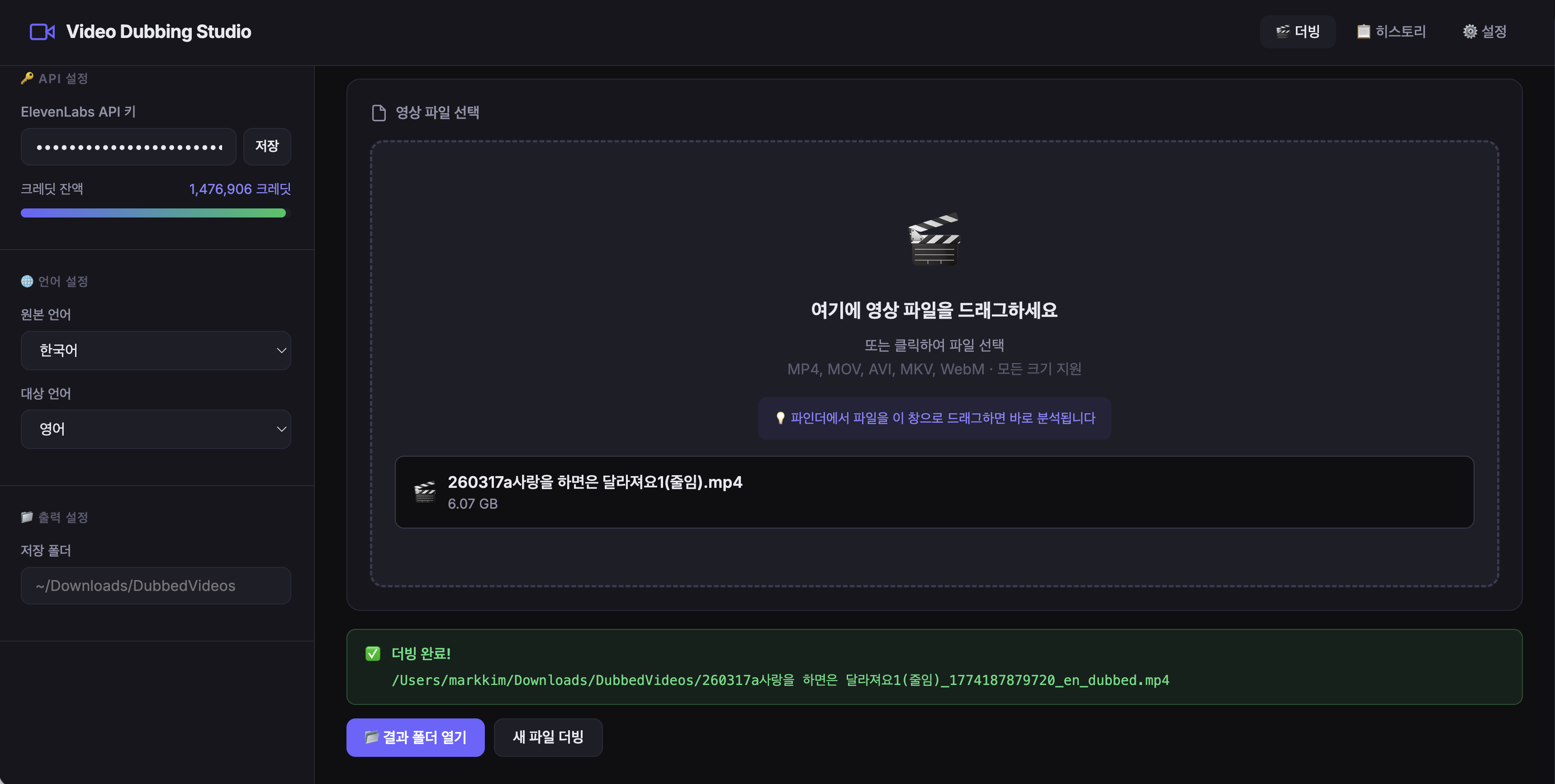 로컬 영상 파일을 드래그 한 번으로 17개 언어로 AI 더빙하는 데스크탑 웹앱